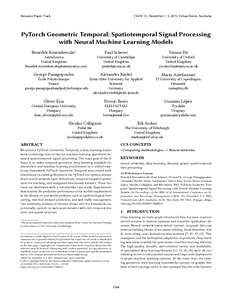 Rozemberczki, B and Scherer, P and He, Y and Panagopoulos, G and Riedel, A and Béres, Ferenc (2021) PyTorch Geometric Temporal: Spatiotemporal Signal Processing with Neural Machine Learning Models. In: CIKM '21: Proceedings of the 30th ACM International Conference on Information & Knowledge Management. ACM Press, New York (NY), pp. 4564-4573. ISBN 9781450384469 10.1145/3459637.3482014
