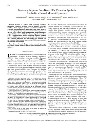 Bloemers, T. and Oomen, T. and Tóth, Roland (2022) Frequency Response Data-Based LPV Controller Synthesis Applied to a Control Moment Gyroscope. IEEE TRANSACTIONS ON CONTROL SYSTEMS TECHNOLOGY, 30 (6). pp. 2734-2742. ISSN 1063-6536 10.1109/TCST.2022.3152626
