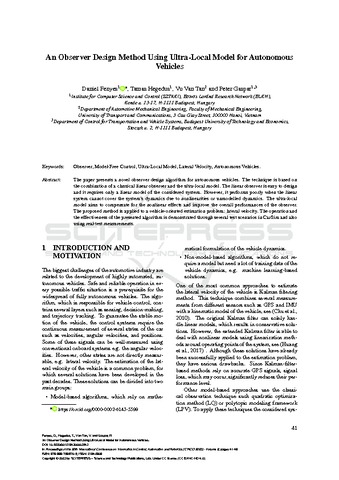 Fényes, Dániel and Hegedűs, Tamás and Van Tan, Vu and Gáspár, Péter (2023) An Observer Design Method Using Ultra-Local Model for Autonomous Vehicles. In: Proceedings of the 20th International Conference on Informatics in Control, Automation and Robotics. SciTePress Science and Technology Publications, Lda, Setubal, pp. 41-49. ISBN 9789897586705 10.5220/0012184300003543